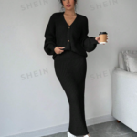 2 pièces/ensemble femme décontracté couleur unie cardigan et jupe,