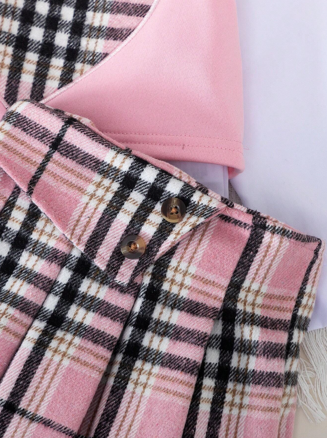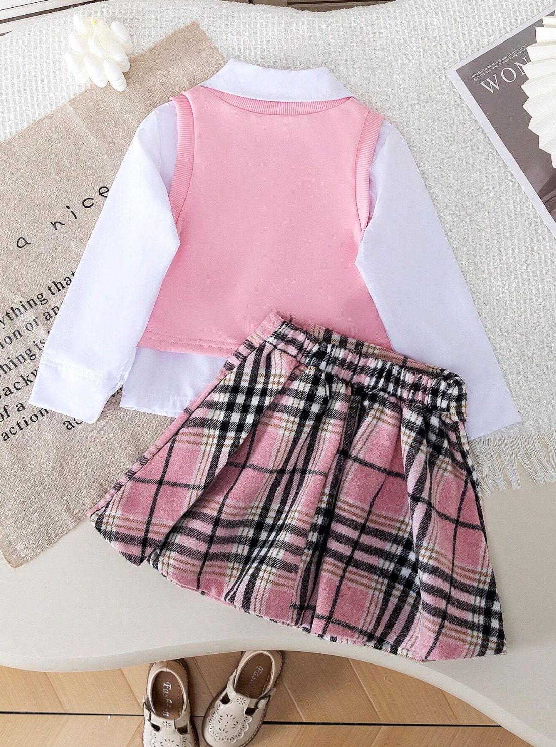 Be the first to review “Ensemble 3 pièces Chemise unie casual, Gilet à motif de cœurs à carreaux et Jupe à carreaux”