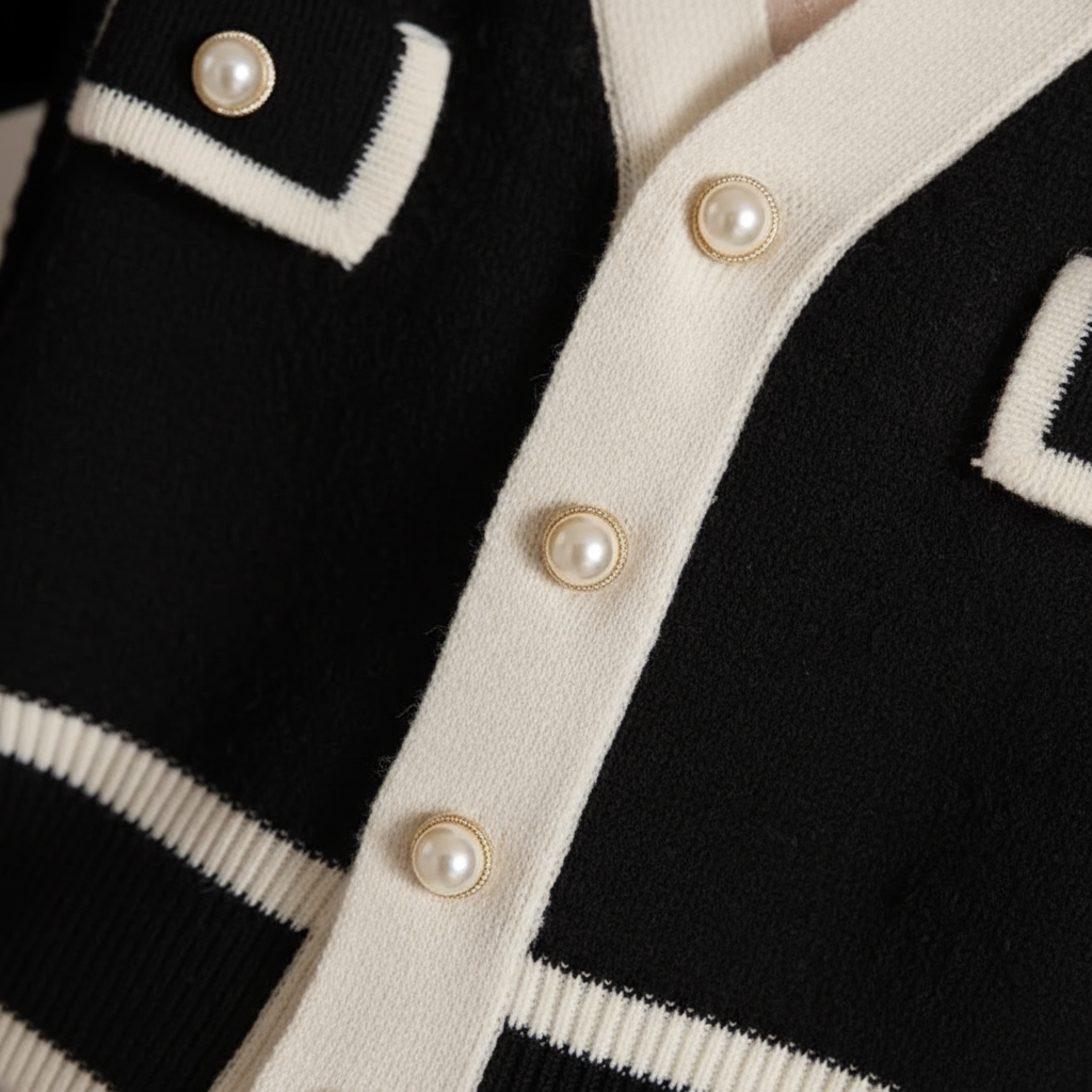 Craquez pour ce sublime gilet cardigan femme inspiré du style iconique Chanel ! Avec ses contrastes noir et blanc sophistiqués et ses détails raffinés, ce cardigan court deviendra LA pièce maîtresse de votre garde-robe élégante.