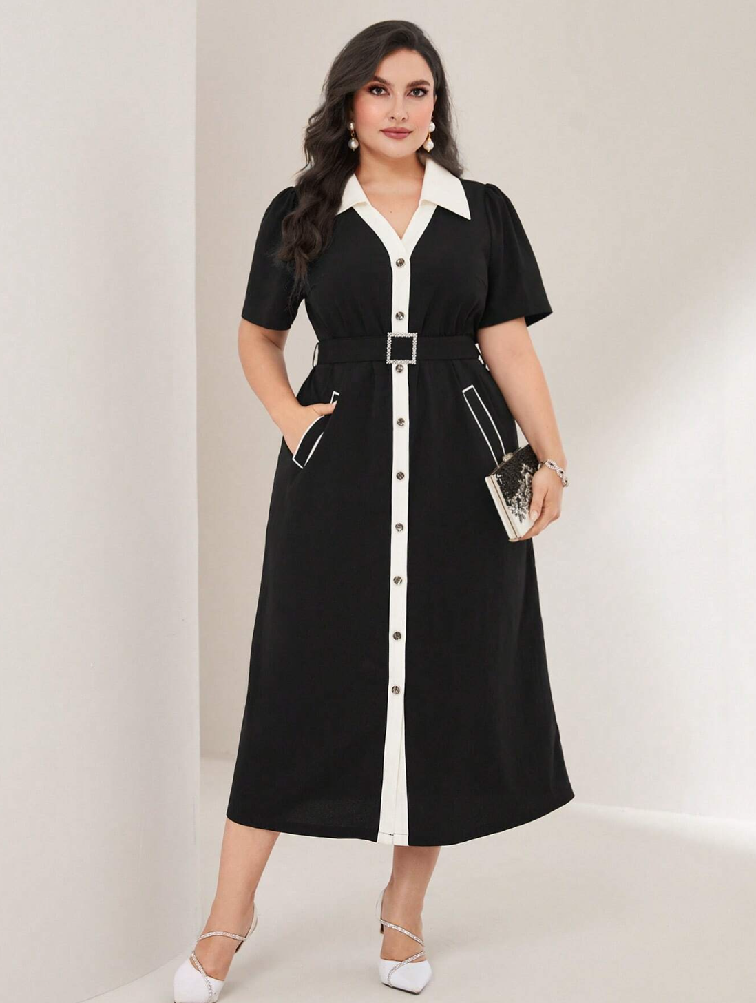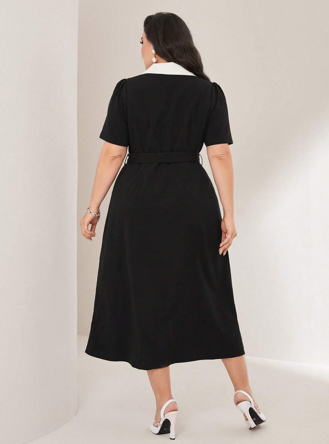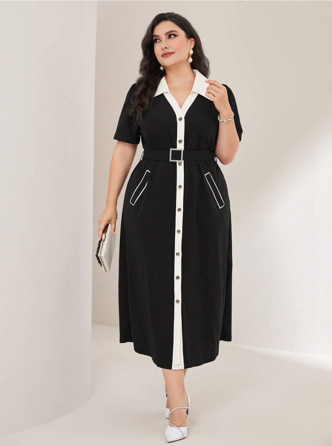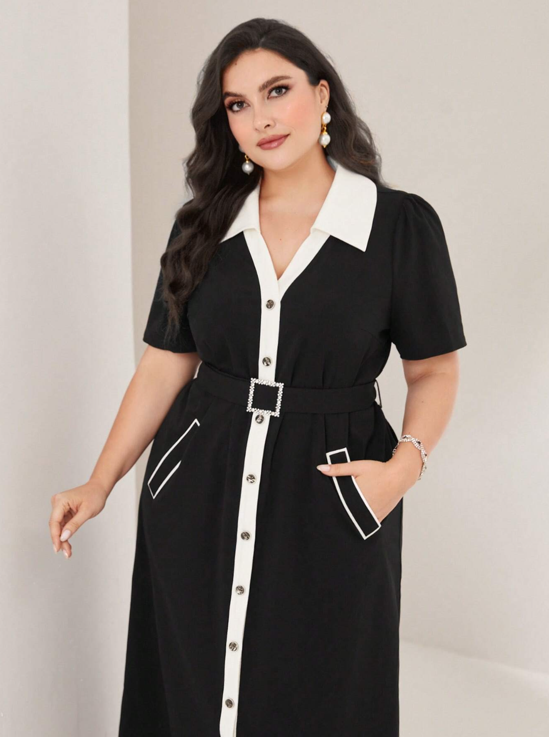 SHEIN Modely Plus Robe Chemise À Bordure Contrastante À Bouton Ceinturé
