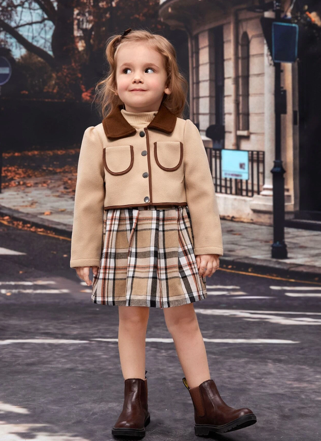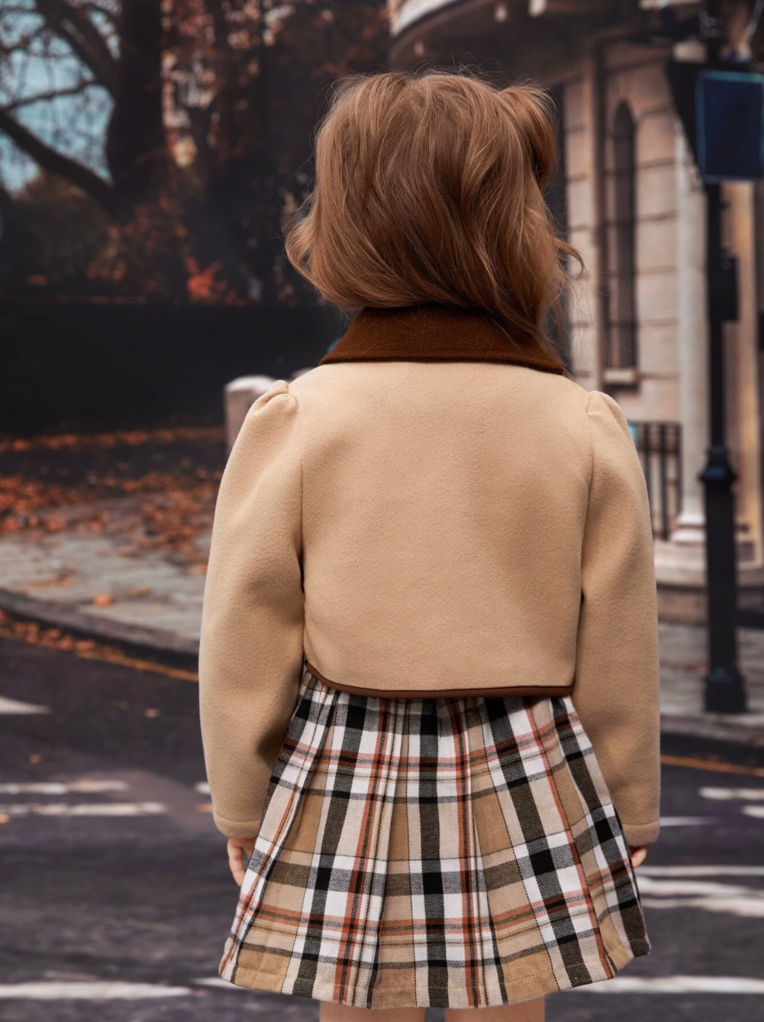 Veste à col contrasté avec manches bouffantes et jupe plissée à carreaux